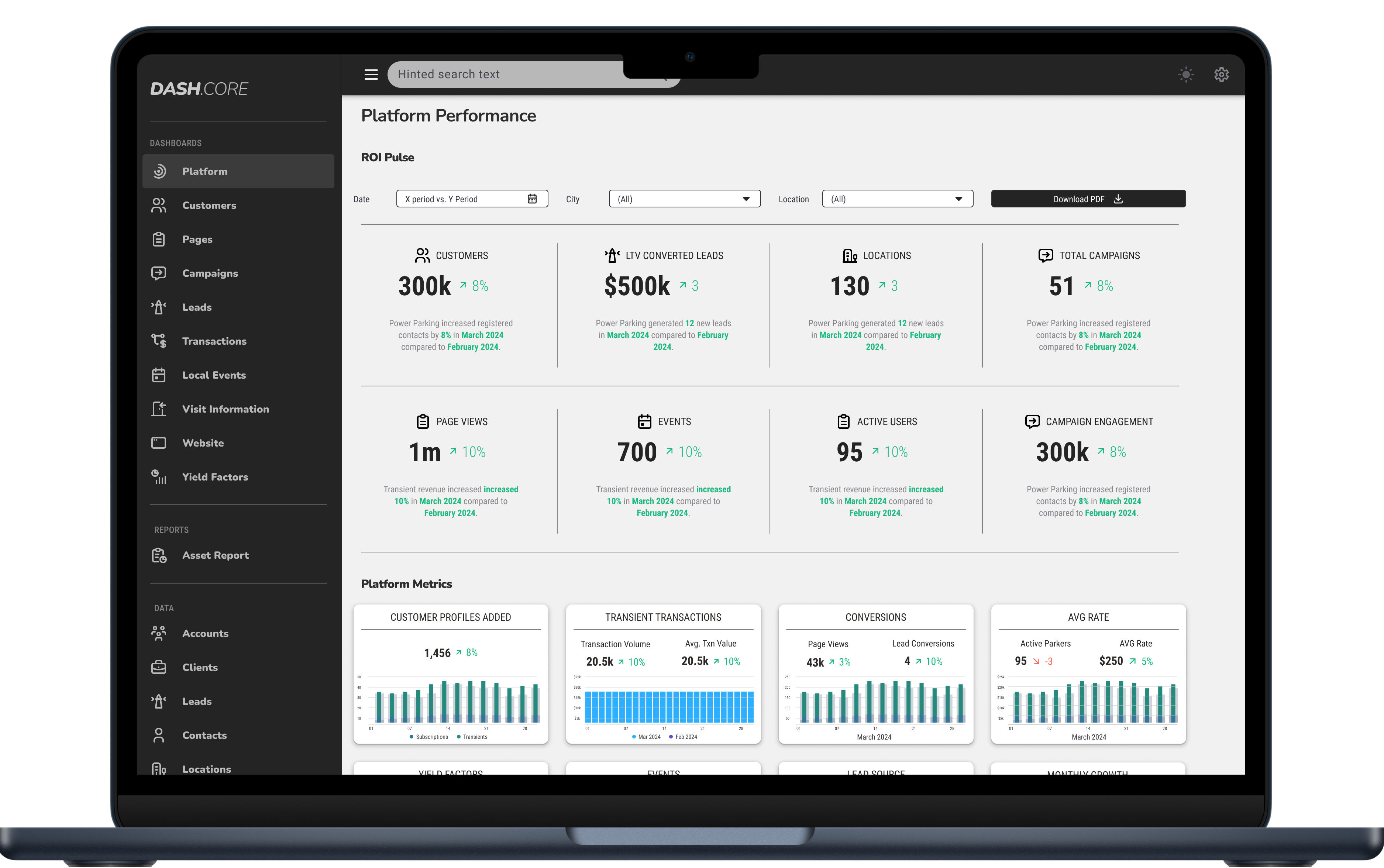 The engine behind your digital operations - built for performance, scalability, and flexibility.Dash.Core aggregates and normalizes data from multiple systems - such as PARCS, payment platforms, and digital campaigns- into a single source of truth. With customizable dashboards, real-time reporting, and API integrations, Core provides the foundation for data-driven operations, enabling teams to measure ROI, automate workflows, and unlock actionable insights.