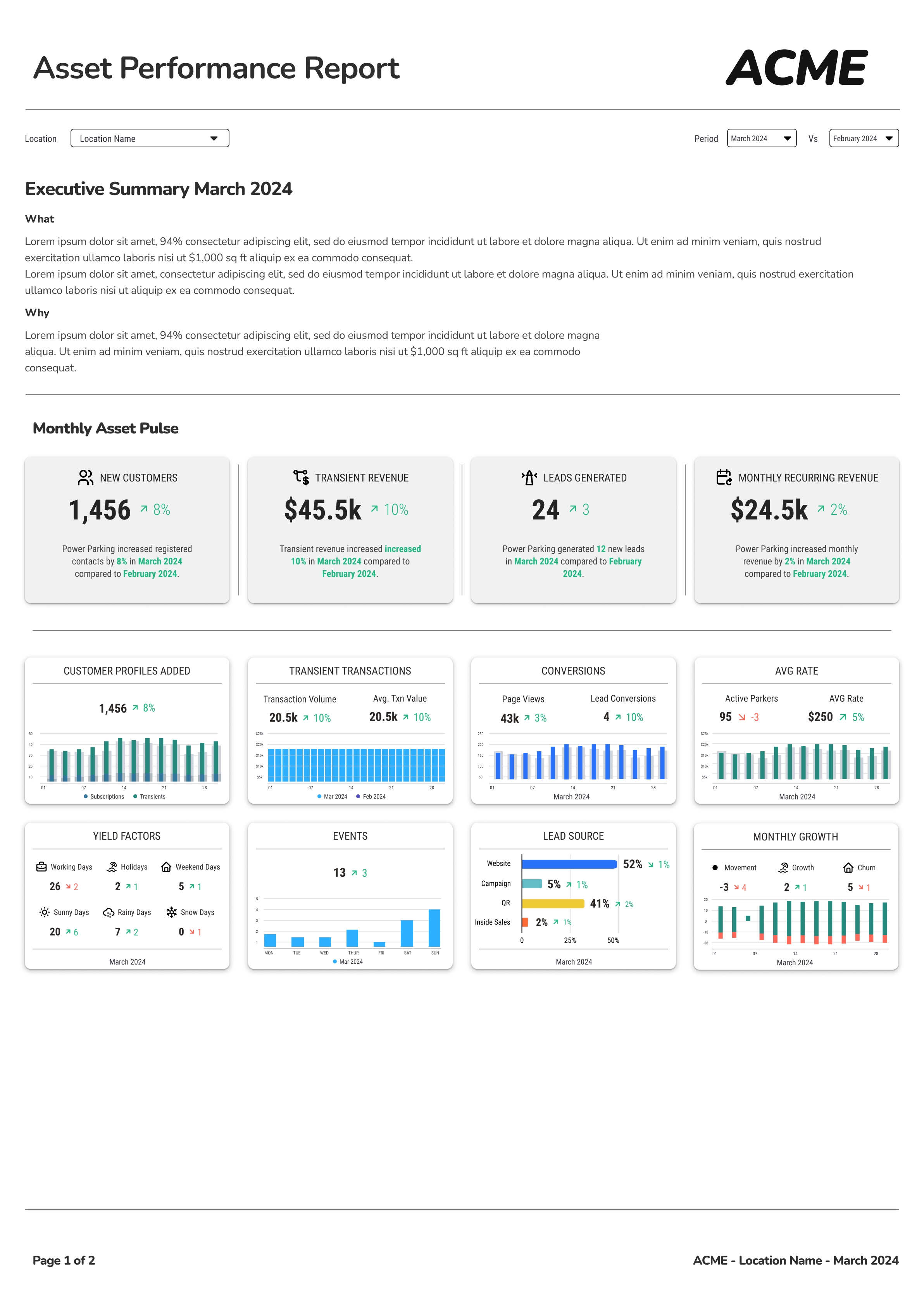 Dash.Reports turns complex operational and marketing data into clear, actionable intelligence. Monthly and quarterly reports track key KPIs, benchmark performance across locations, and highlight long-term trends through intuitive visuals and narrative summaries. Automated delivery keeps stakeholders informed and aligned—without manual effort.